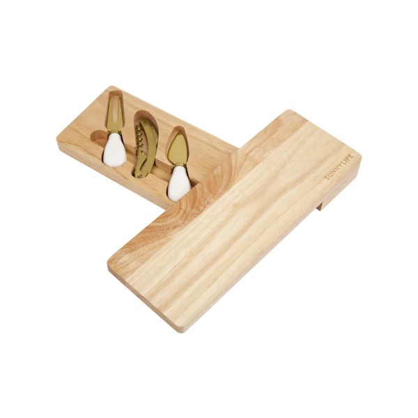 Slimline packaging of a cheese knife, fork and wine opener within a solid timber frame makes for convenient outdoor feasting all year around. With a lid that converts to a platter, this nifty picnic accessory has solid appeal.