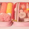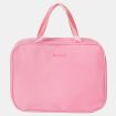 Crafted from pretty and practical recycled nylon in soft fairy floss pink, this hanging cosmetic bag is lined in brighter lipstick pink and features two generously sized compartments.